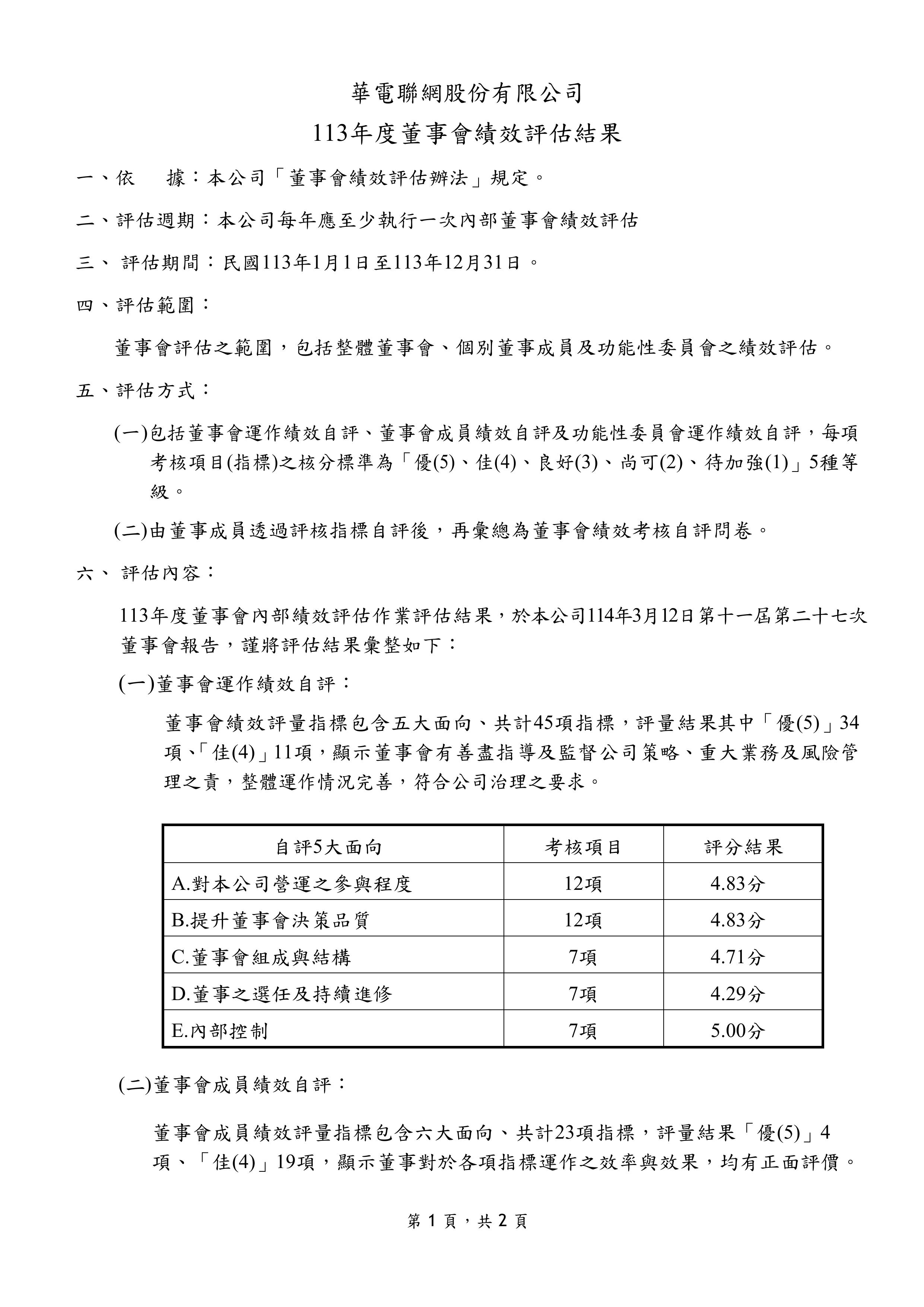 (1)董事會績效評估:包括對公司營運之參與程度、董事會決策品質、董事會組成與結構、董事的選任及持續進修、內部控制等。