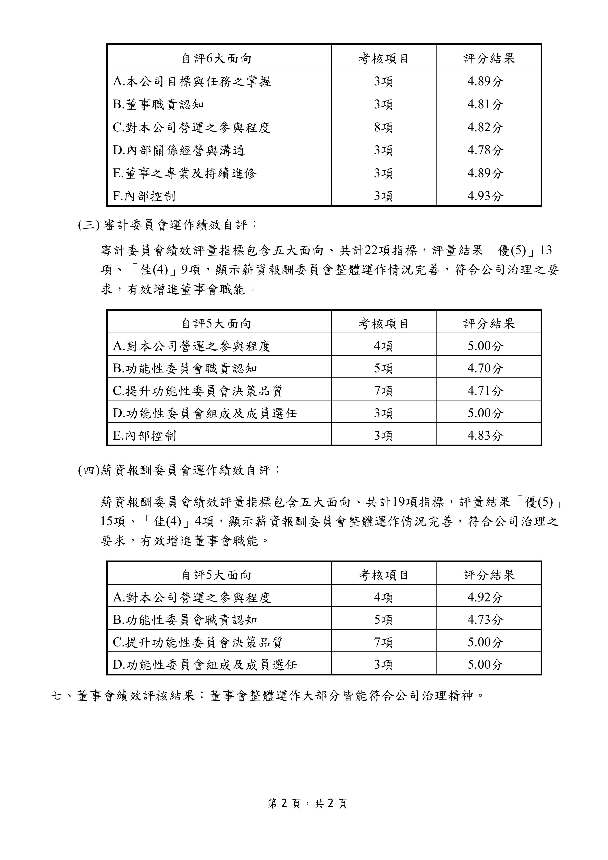 (2)個別董事成員績效評估:包括公司目標與任務之掌握、董事職責認知、對公司營運之參與程度、內部關係經營與溝通、董事之專業及持續進修、內部控制等。